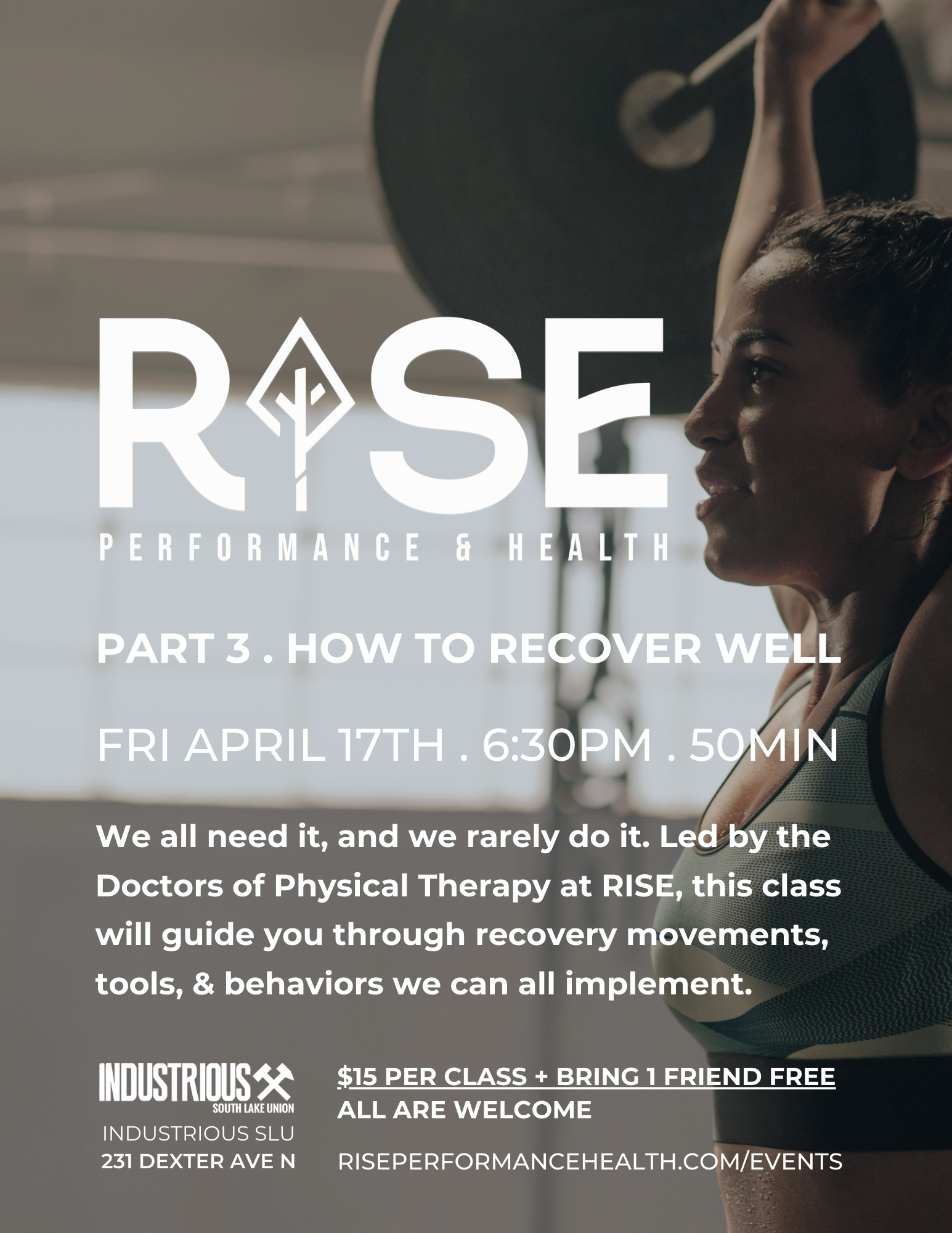 Coming in hot with the final workshop of the the Lifting Foundations Series! RISE is partnering with Industrious South Lake Union to amplify your lifting game. You've learned how to lift safely and activate your core—now discover the recovery strategies that keep you lifting strong for the long haul.